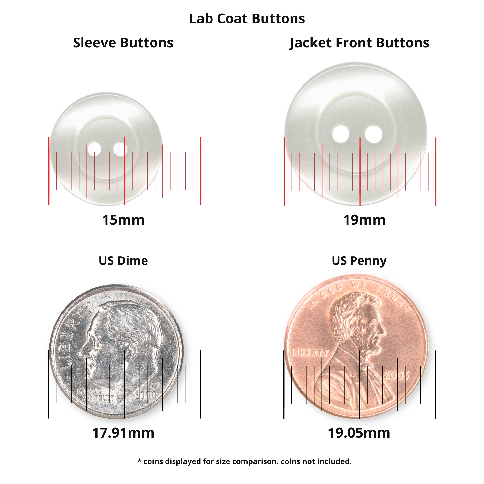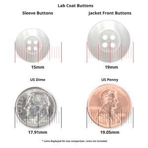 Keep a professional appearance when you’re at work with these lab coat buttons. Designed to fit most lab coats, medical clothing, or garments, these are ideal for medical professionals. Buttons are available in two shades; White color and Clear color. These lab buttons feature a smooth, circular design that easily accommodates the fabric, and the polished finish prevents scratches. The round-edged rim holds fast on the lab coat. ButtonMode offers two different lab buttons (two holes and four holes) to match all kinds of white laboratory coats. Each set includes 22 buttons; 11 buttons measuring 3/4″ (0.75 in / 1.9 centimeters / 19 millimeters) used for the jacket front; and 11 buttons measuring 5/8″ (0.62 in / 1.5 centimeters / 15 millimeters) used for the jacket sleeve. These are the most commonly used size for a lab coat. ButtonMode buttons work with most types of button-up lab coat, side button lab coat, long sleeves lab coat, cotton lab coat, men’s lab coat, and women’s lab coat. These lab buttons are made from superior quality nylon material that is both thick and durable. It can take hard knocks and does not fade, scratch, or break easily. Use it to replace any missing, broken, or tarnished buttons. Each button is manufactured in the USA. ButtonMode ensures better customer service by providing an assurance policy on all the products.